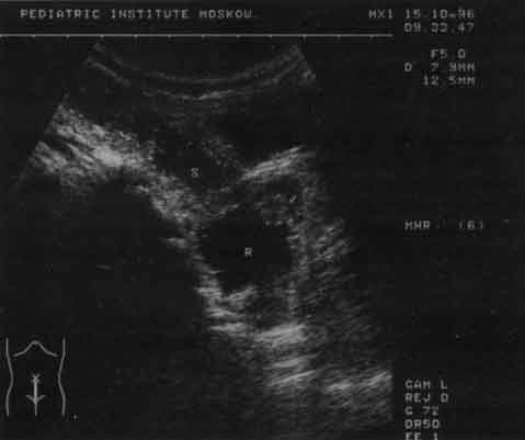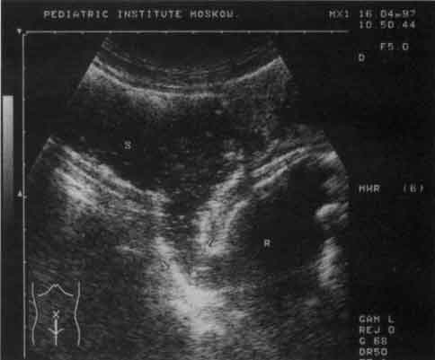 Рис. 11. Эхограмма прямой (R) и сигмовидной (S) кишки при болезни Гиршпрунга.
