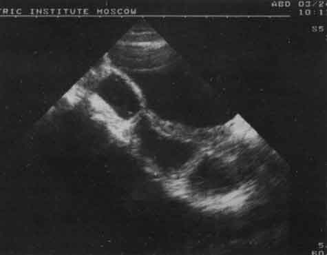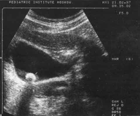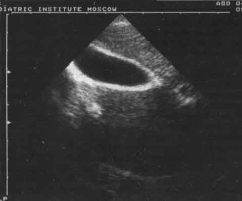 Изменения желчного пузыря были представлены в основном нарушением его формы - перегибы в области дна, тела (21%), S-образные перегибы (9%) и наличие перегородок и перетяжек (7%). У 12% детей имело место увеличение желчного пузыря, у 8% - утолщение стенок более чем на 2 мм, что является ультразвуковым признаком холецистита. У 0,5% детей в просвете пузыря были выявлены конкременты, размер которых не превышал 6 мм, из них у 82% они не были кальцинированы. Этот вывод был сделан на основании отсутствия "дистальной тени" за эхосигналом от конкремента. Оценка сократительной функции желчного пузыря позволила в 83% случаев выявить ее нарушение, причем в 71% из них оно носило гипомоторный характер. В ряде случаев перечисленные отклонения в состоянии желчного пузыря были смешанными. Чаще всего наблюдалось сочетание аномалий с увеличением желчного пузыря (рис. 3 - 5).