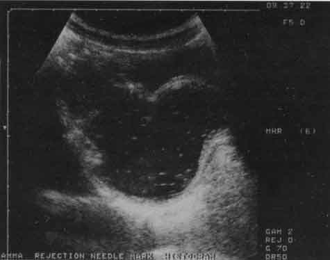 Рис. 9. Эхограмма мочевого пузыря при цистите (поперечный срез). Имеется резкое утолщение его стенок.