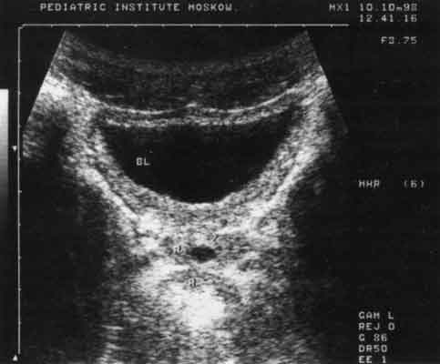 Следует подчеркнуть, что при направлении на эхографию почек не нужно назначать специальную водную нагрузку. Обследовать ребенка необходимо при естественно заполненном мочевом пузыре, особенно при оценке последнего на предмет остаточной мочи. В 99% случаев повторное исследование мочевого пузыря после микции выполняется через 5, а то и 10 мин. Для заполнения же мочевого пузыря после водной нагрузки на треть или половину его объема бывает достаточно 1 - 2 мин. В результате дается неверное заключение о наличии остаточной мочи и делаются соответствующие выводы.